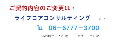 ライフコアコンサルティング 〒558-0023 大阪市住吉区山之内2丁目7-27-103 TEL 06-6777-3700 FAX 06-6777-3707 営業時間 AM9時からPM5時 定休日 土日祝